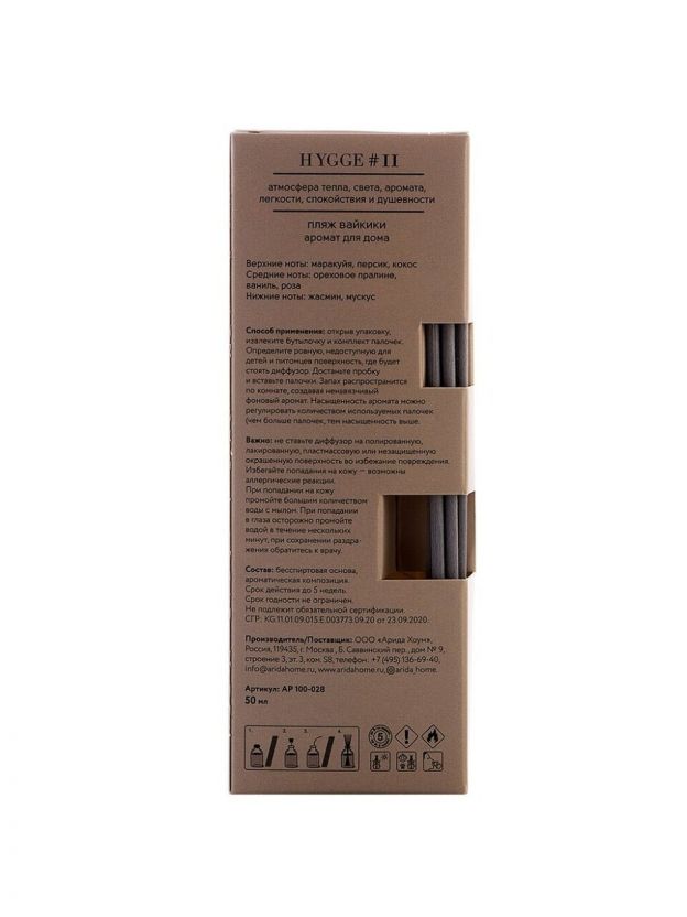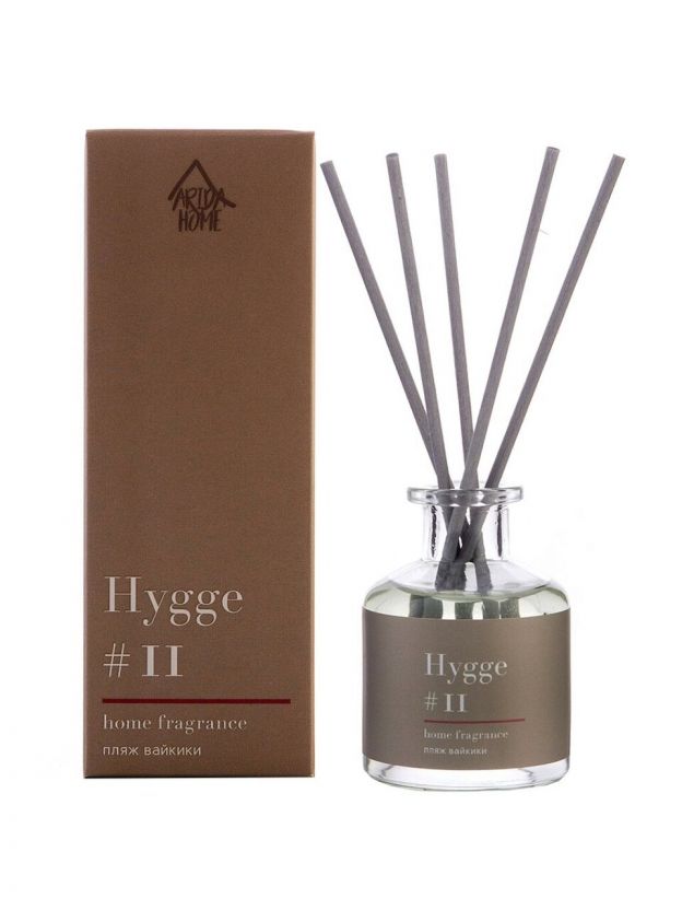 Аромадиффузор с палочками Arida Home Hygge #11 Пляж Вайкики — это безопасный экологически чистый и натуральный способ ароматизации помещения, является прекрасной альтернативой ароматизированным спреям. Стильный дизайн этого модного ароматического аксессуара украсит любой интерьер. Диффузор представляет собою изящную стеклянную емкость с ароматной жидкостью. В нее вставляются несколько длинных фибровых палочек. Постепенно, насыщаясь эфирными маслами, они распространяют аромат по всей комнате. Палочки важно применять сразу все и периодически переворачивать (1–2 раза в сутки). Флакона объемом 50 мл хватит на помещение площадью до 15 кв.м. Срок службы диффузора от 1,5 до 2 -х месяцев, в зависимости от места использования. В более влажных помещениях срок использования сокращается.