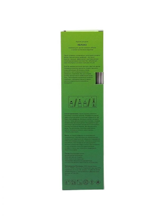 Ароматический диффузор Arida Home Яблоко с фибровыми палочками - это безопасный экологически чистый и натуральный способ ароматизации помещения, является прекрасной альтернативой ароматизированным спреям. Стильный дизайн этого модного ароматического аксессуара украсит любой интерьер. Обладает освежающим ароматом зеленого яблока с нотами тропических фруктов. Диффузор представляет собою емкость с ароматной жидкостью. В нее вставляются несколько длинных фибровых палочек. Постепенно, насыщаясь эфирными маслами , они распространяют аромат по всей комнате. Палочки важно применять сразу все и периодически переворачивать (1-2 раза в сутки). Флакона, объемом 50 мл, хватит на помещение площадью до 15 м2. Срок службы диффузора от 1,5 до 2-х месяцев, в зависимости от места использования. В более влажных помещениях срок использования сокращается. Состав: бесспиртовая основа, ароматическая композиция.
