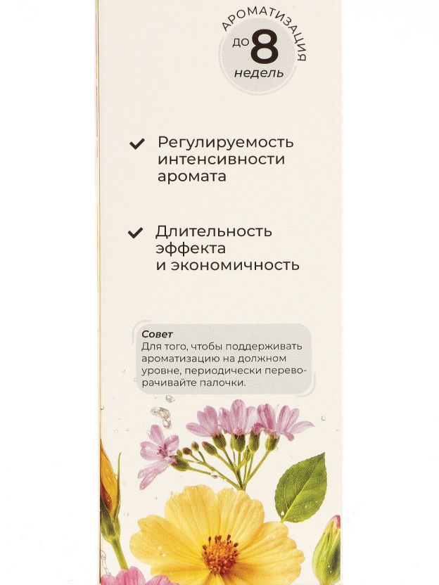 Средний срок действия аромата — до 6 недель. Этому способствует плотный стеклянный флакон и натуральные масла, которые медленно испаряются через палочки.