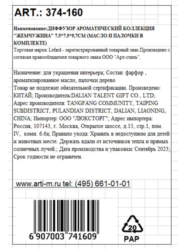 Аромадиффузор Lefard, 7.5х9.7 см, Коллекция Жемчужина, масло + палочки, 374-160