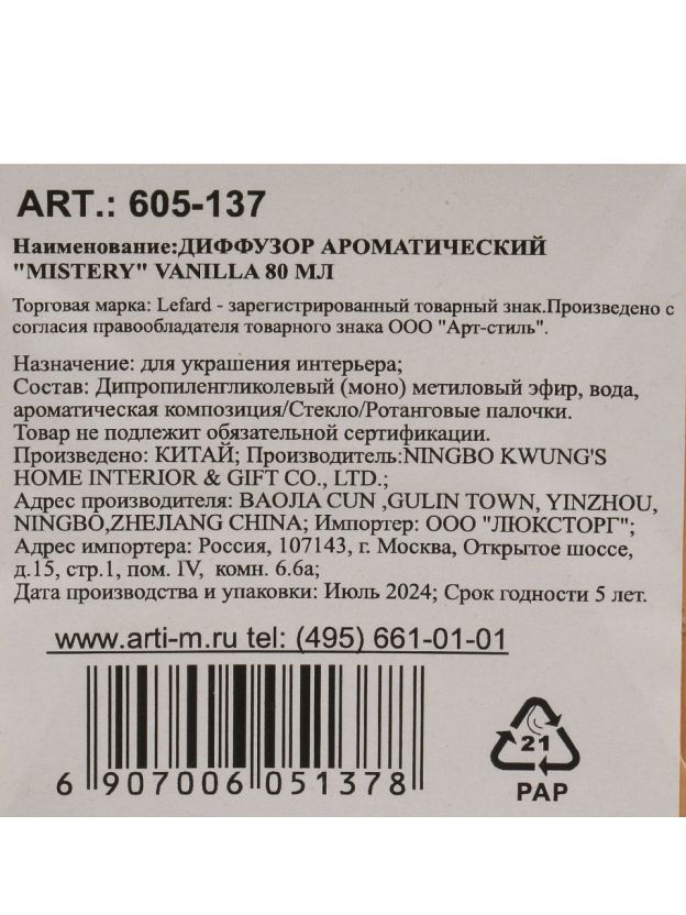 Аромадиффузор Lefard, 80 мл, Mystery Vanilla, 605-137