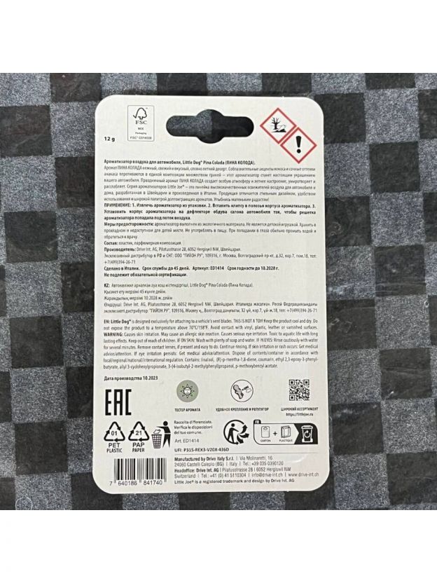 Ароматизатор в машину на дефлектор, сухой 3D, Little Joe, "DOG" Пина Колада, КА-00058919