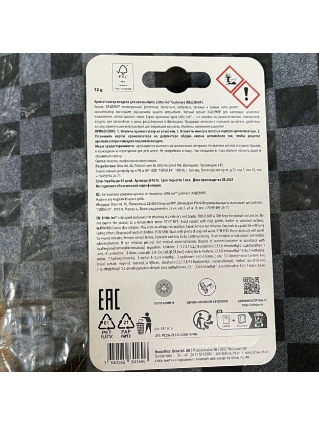 Ароматизатор для автомобиля Little Joe изготовлен из EVA, термопластичного, нетоксичного полимера.