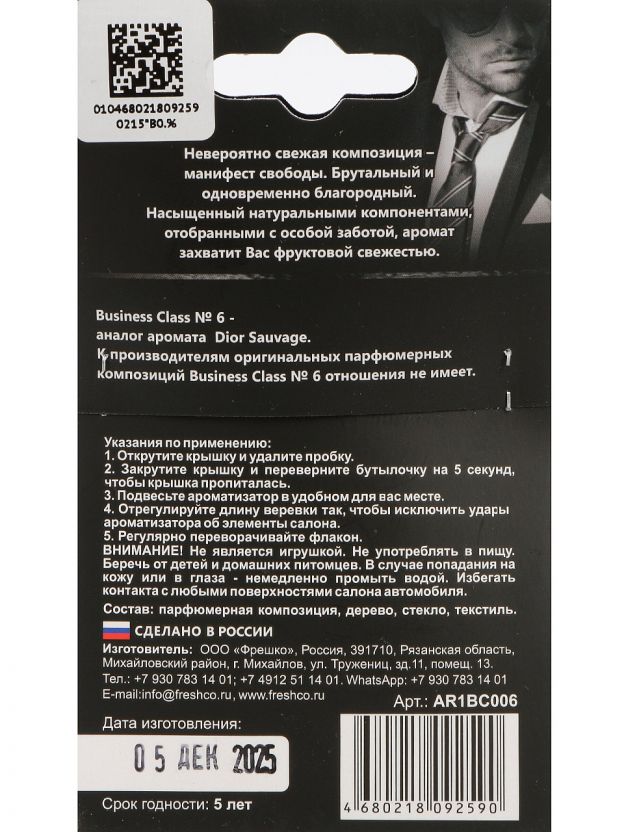 Освежите салон автомобиля с ароматизатором Freshco Business Class Dior: стильный бочонок, премиальный аромат, до 45 дней действия — идеален для подарка и поездок. Почему выбирают: Эффект бизнес-класса: уникальный аромат Dior создаёт атмосферу уюта и статуса в любой машине. Компактный бочонок: выполнен из прочных материалов, подходит для подвешивания, сохраняет запах до 45 дней. Универсальность: отлично впишется в интерьер авто, дома, на даче или станет оригинальным подарком. Подвесной ароматизатор в машину Freshco Business Class Dior — это идеальное решение для тех, кто ищет стойкий, ненавязчивый, но выразительный запах. Благодаря формату бочонка и удобной подвеске, ароматизатор легко разместить в любом авто, на даче или даже дома. Если вы спрашиваете, какой выбрать ароматизатор для машины, чтобы он долго сохранял свежесть и не перебивал естественный запах, обратите внимание на этот вариант: он сочетает премиальный дизайн и качественную ароматическую композицию. Многие покупатели интересуются, подходит ли такой ароматизатор для подарка или использования вне автомобиля. Ответ — да: стильная упаковка и универсальный аромат делают Freshco Business Class Dior отличным выбором для подарка коллегам, друзьям или близким. В отличие от аналогов с агрессивными запахами, этот бочонок обеспечивает мягкое, равномерное распространение аромата и не раздражает даже при длительном использовании. Как использовать: просто повесьте на зеркало или в любое удобное место — аромат начнёт работать сразу. Выбирая подвесной ароматизатор Freshco, вы получаете долговечный и эстетичный аксессуар, который подчеркнёт ваш стиль и подарит ощущение свежести в любой обстановке. Закажите сейчас — выгодная цена и гарантия оригинального качества от официального продавца. Частые вопросы: Какой срок службы у ароматизатора Freshco Business Class Dior? Средний срок действия аромата — до 45 дней, благодаря продуманной конструкции бочонка и качественным ароматическим компонентам. Подходит ли этот ароматизатор для дома или дачи? Да, благодаря универсальному дизайну и приятному аромату, бочонок отлично освежает не только салон автомобиля, но и помещения дома или дачи. Какой размер и тип крепления у данного ароматизатора? Модель выполнена в компактном формате подвесного бочонка, легко крепится на зеркало заднего вида или другие элементы интерьера с помощью прочной нити.