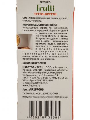 Яркий и стойкий аромат Тутти-Фрутти — эксклюзивная формула Freshco для долгого эффекта и приятной атмосферы в машине.