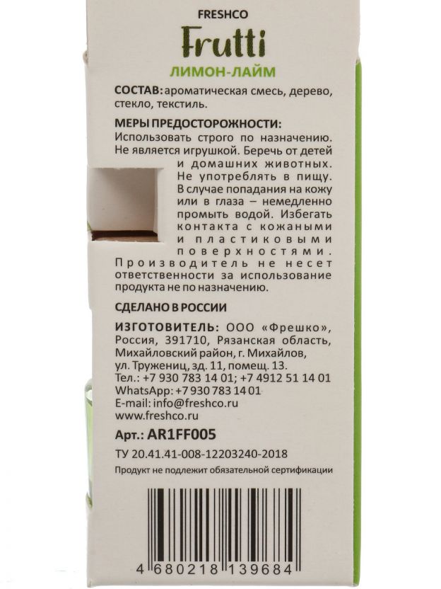 Свежий ароматизатор в машину Freshco Frutti Лимон-Лайм: до 60 дней сочного цитрусового настроения, компактный подвесной бочонок — избавьтесь от запахов быстро и стильно.