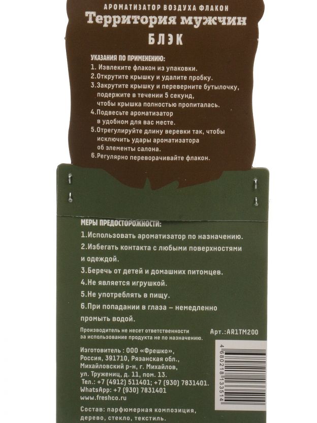 Ароматизатор в машину Партизан Блэк: стильный подвесной бочонок Freshco — до 60 дней свежести, защита от запахов, премиальный дизайн для авто и дома. Почему выбирают: Уникальный аромат с технологией длительного высвобождения — сохраняет свежесть в салоне до 2 месяцев. Компактный подвесной формат-бочонок из натурального дерева, не занимает место на панели и защищён от протечек. Идеален для автомобиля, дома, дачи или в подарок — универсальное решение для любой обстановки. Подвесной ароматизатор для машины ТМ Партизан Блэк от Freshco — это современное решение для устранения неприятных запахов и создания комфортной атмосферы в салоне автомобиля, на даче или в домашнем интерьере. Благодаря натуральному деревянному бочонку и запатентованной формуле, запах распространяется равномерно и не теряет насыщенности до 60 дней. Если вы ищете, какой ароматизатор выбрать для машины, обратите внимание на Партизан Блэк — он не только эффективно нейтрализует запахи, но и стильно смотрится в любом интерьере. Пользователи часто спрашивают, чем отличается подвесной бочонок от обычных картонных ароматизаторов. В отличие от большинства аналогов, Партизан Блэк не содержит жидкостей, которые могут пролиться, и выполнен из натурального дерева с влагозащитной пропиткой. Это делает его безопасным для детей и домашних животных. Как использовать подвесной ароматизатор? Просто повесьте бочонок на зеркало или в любое удобное место — он начнет работать сразу после вскрытия упаковки. Подходит ли для подарка? Да, благодаря стильной упаковке и универсальному аромату, такой аксессуар станет отличным презентом для автолюбителей и ценителей уюта. Оформите заказ на ароматизатор в машину Партизан Блэк прямо сейчас — получите свежесть, стиль и защиту от запахов по выгодной цене с быстрой доставкой по России. Частые вопросы: Какой срок службы у ароматизатора Партизан Блэк? Средний срок действия — до 60 дней, благодаря технологии постепенного высвобождения аромата и натуральному дереву с влагозащитной пропиткой. Чем выгоден подвесной бочонок для авто? Бочонок занимает минимум места, не проливается, безопасен для детей и домашних животных, а также подходит для использования в машине, доме или на даче. Какие параметры и материалы у этой модели? Ароматизатор выполнен из натурального дерева, подвесной тип, компактный размер, артикул AR1TM200, бренд Freshco, модель Партизан Блэк, страна продавца — Россия.