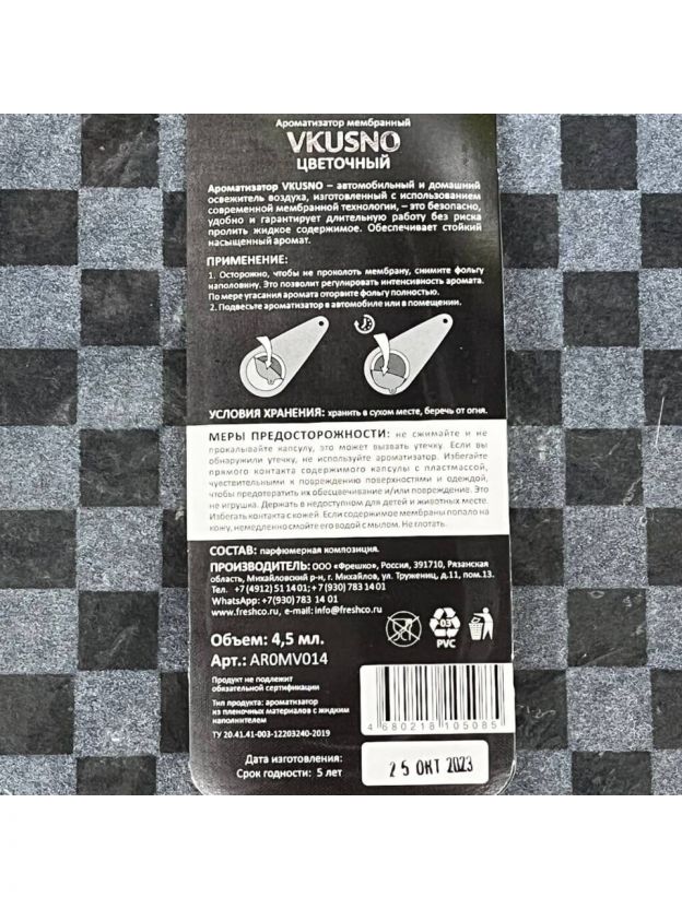 Ароматизатор в машину подвесной, мембрана, Freshco, Vkusno Цветочный, AR0MV014