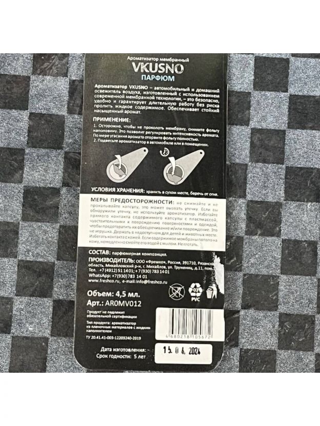 Ароматизатор в машину подвесной, мембрана, Freshco, Vkusno Парфюм, AR0MV012