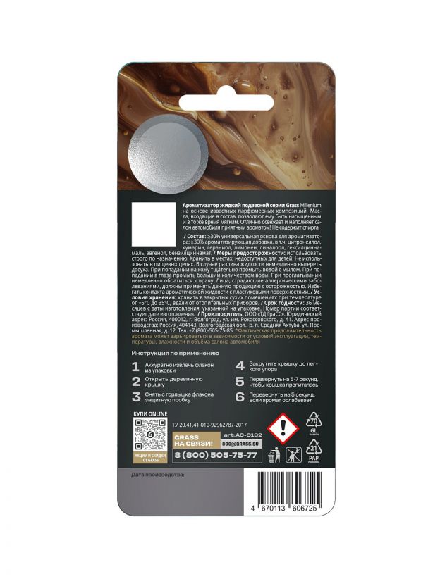 Состав: _ 25% высококонцентрированная парфюмерная композиция на масляной основе, _75% универсальная основа для ароматизаторов.
