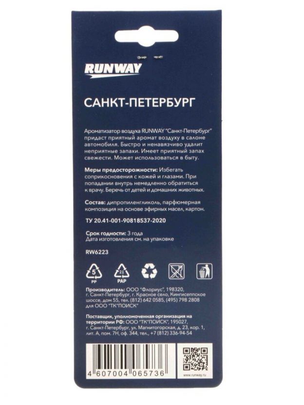 Ароматизатор воздуха в машину подвесной, сухой, Runway, Пинаколада, “СПБ”, RW6223