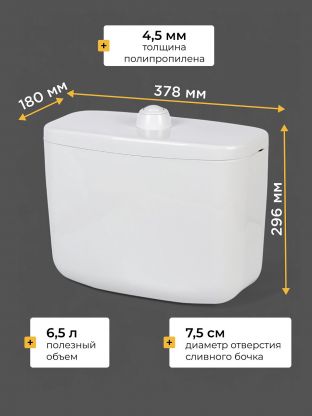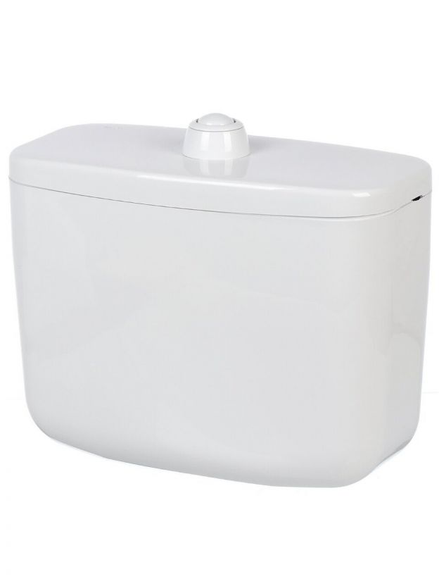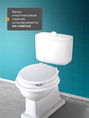 Бачок пластмассовый нижний,устанавливается на унитаз .Изготовлен из полиэтилена низкого давления. Арматура с нажимной кнопкой пуска воды, поплавковый запорный клапан пластиковый с регулируемым коромыслом, без полочки.