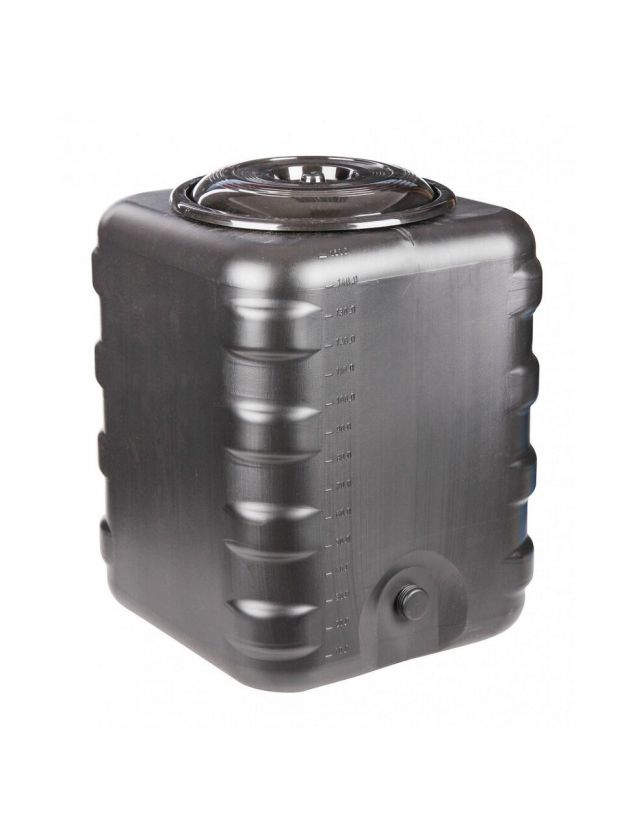 Объем — 150 л, размеры: длина 50,1 см, ширина 50,1 см, высота 66 см, диаметр горловины 33 мм, форма квадратная, цвет черный, без крышки.