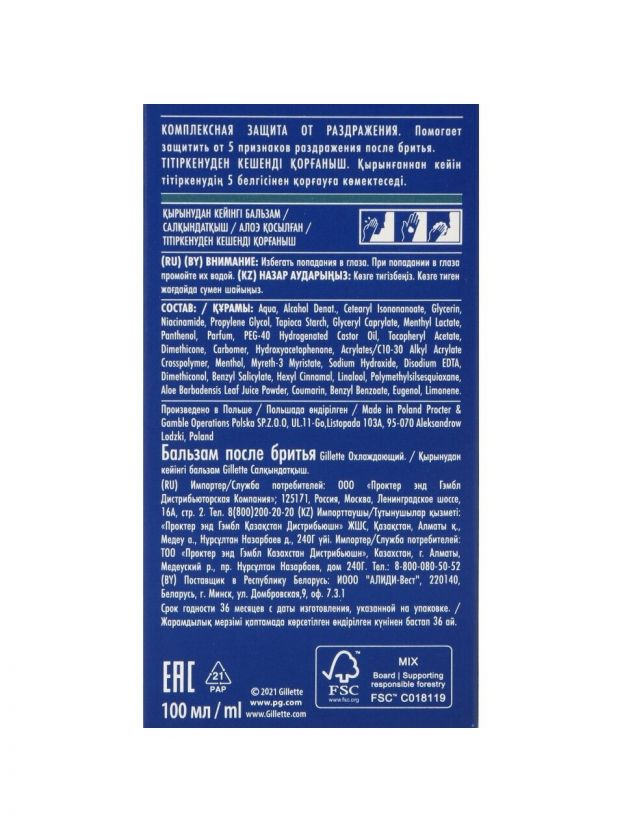Бальзам Gillette Охлаждающий рассчитан на нормальную кожу, не содержит компонентов для чувствительной кожи. Объем флакона — 100 мл, страна продавца — Польша.