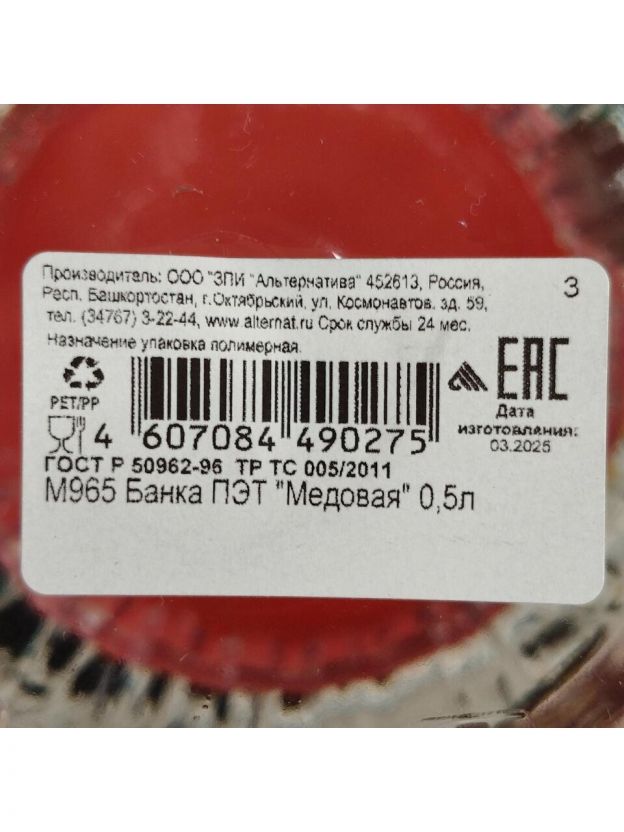 Банка для меда и варенья, пластик, 0.5 л, 12 см, с крышкой, Альтернатива, М965, в ассортименте