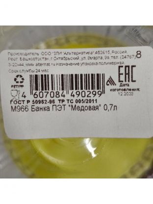 Банка для меда и варенья, пластик, 0.7 л, 14 см, с крышкой, Альтернатива, М966, в ассортименте
