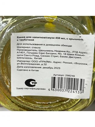 Банка для напитков/смузи стекло, 450 мл, с крышкой, с трубочкой, SDFG0114-2, желтая