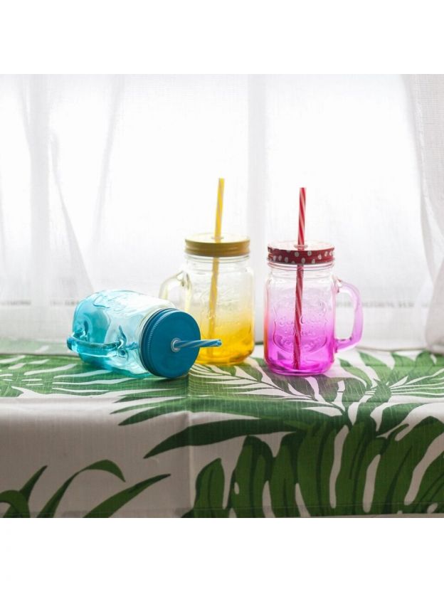 Емкость, которая оснащена удобной ручкой и крышкой, завоевала уважение тех, кто обожает здоровое питание. В оригинальной кружке можно даже готовить полезные завтраки, например, гранолу с йогуртом. Активно используется в барном бизнесе для подачи коктейлей и лимонадов, ее непременно выбирают фуд-блогеры и фотографы. Кроме привычного способа использования, банка для смузи будет хороша в роли вазочки, подсвечника, подойдет для консервации и хранения сыпучих продуктов.