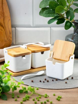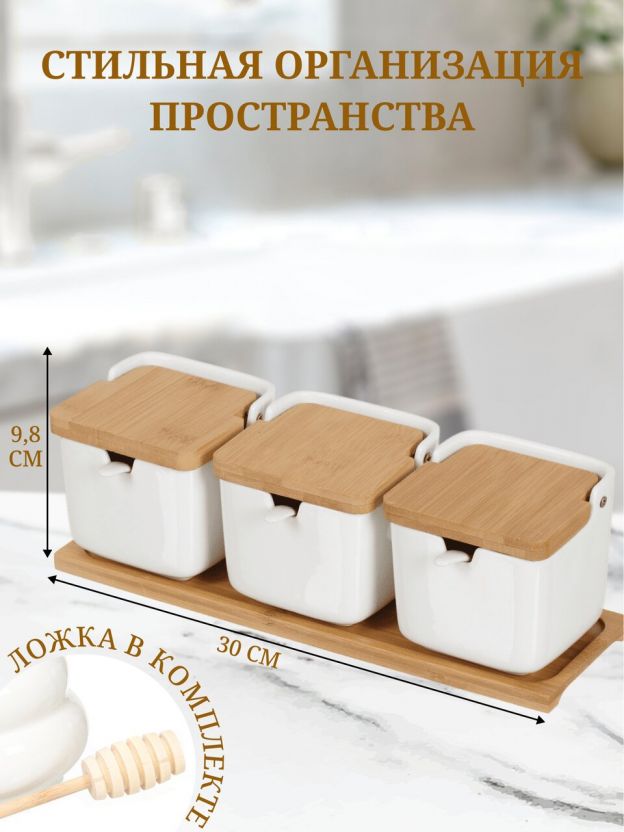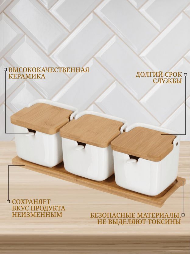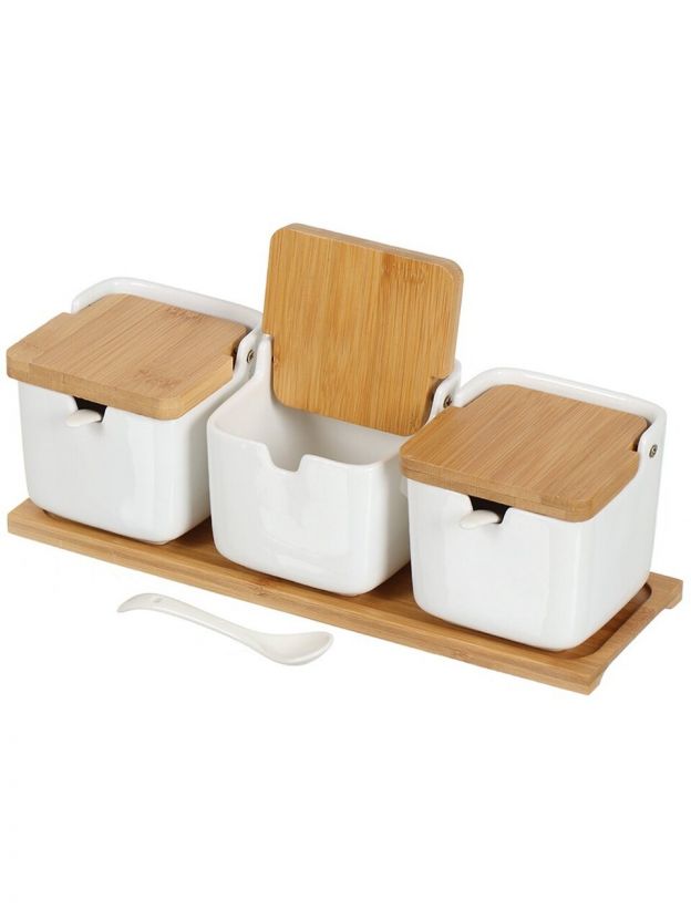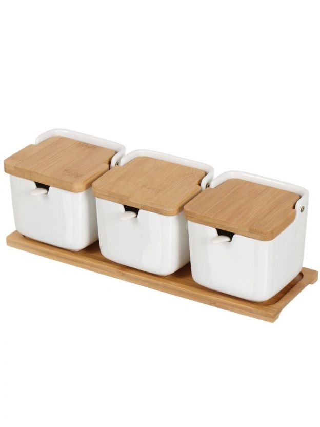 Банка для сыпучих продуктов, керамика, 0.26 л, 30х9.8 см, 3 шт, с крышкой, с ложкой, бамбуковая подставка, Y4-5027, белая