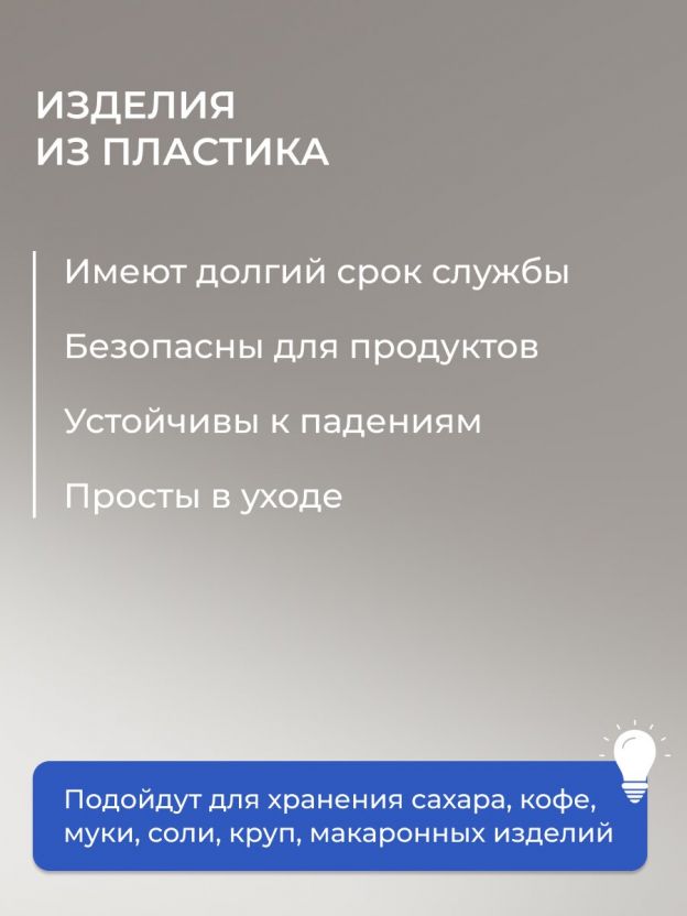 Предназначены для хранения различных сыпучих продуктов: сахара, кофе, муки, соли, круп, макаронных изделий, печенье и многого другого.