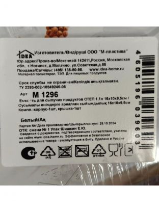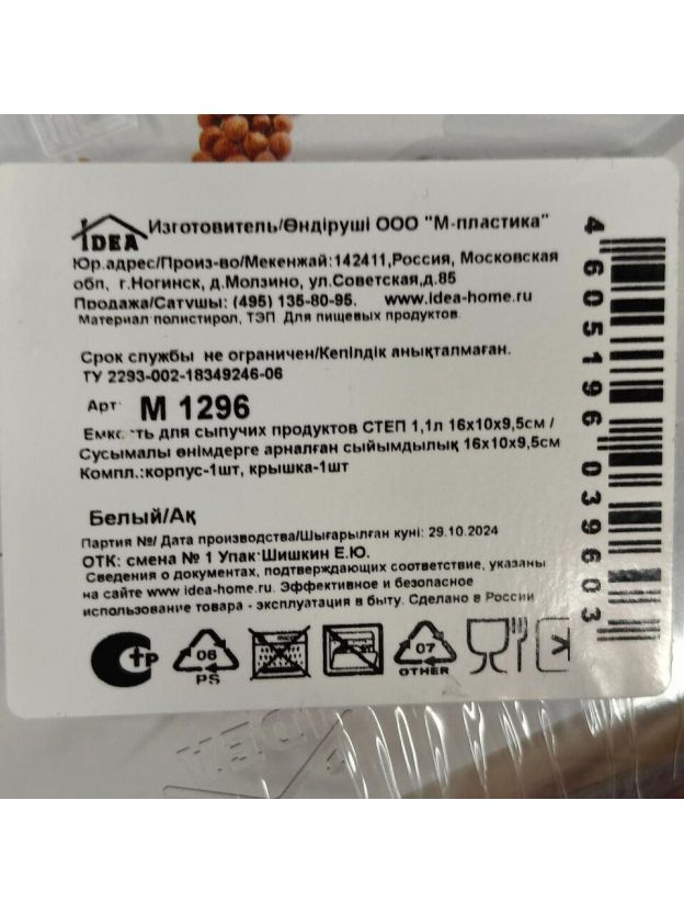 Банка для сыпучих продуктов, пластик, 1.1 л, 16х10х9.5 см, с крышкой, Idea, Степ, М 1296