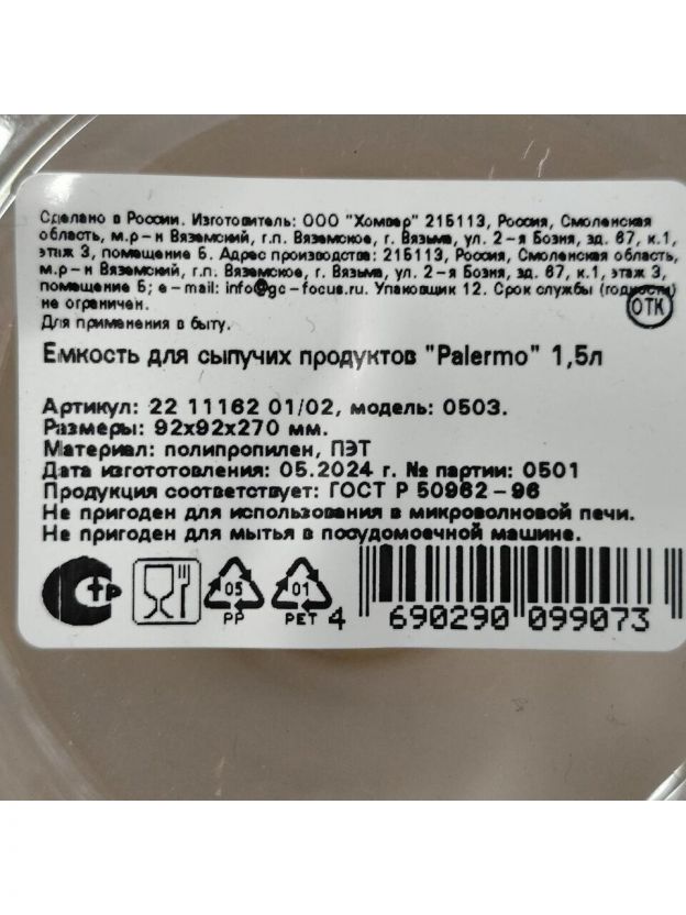 Банка для сыпучих продуктов, пластик, 1.5 л, 9.2х9.2х27 см, с крышкой, Homver, Palermo, 16201/02, прозрачная