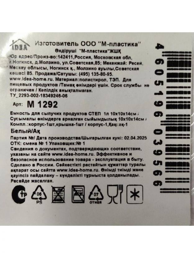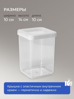 - Удобный объём 1 литр и компактные размеры 10х10х14 см — легко помещается в шкафу или на полке.