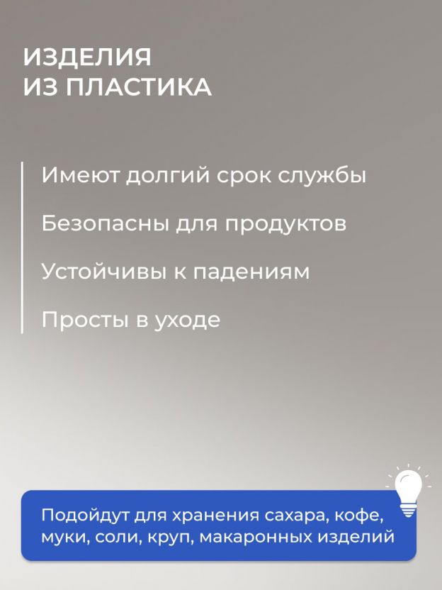 Если вы задаётесь вопросом, как выбрать банку для сыпучих продуктов, обратите внимание на материал и размеры. В отличие от стеклянных аналогов, пластиковая банка легче, не бьётся и безопасна для детей. В ней нельзя использовать микроволновку или мыть в посудомоечной машине, но благодаря гладкой текстуре её легко ополоснуть вручную. Для хранения сахара, муки или орехов дома и на даче — это оптимальное решение. Подходит ли банка для подарка? Да, благодаря универсальному дизайну и компактности она станет практичным презентом для любой хозяйки.