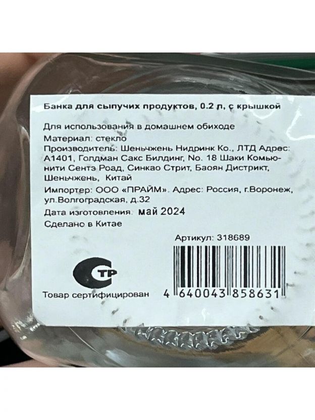 Банка для сыпучих продуктов, стекло, 0.2 л, с крышкой, Y3-1498