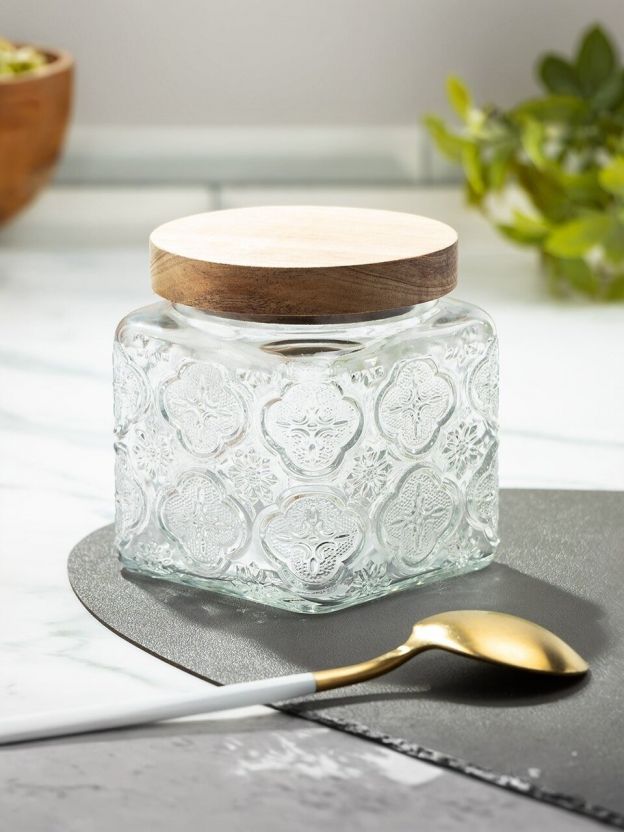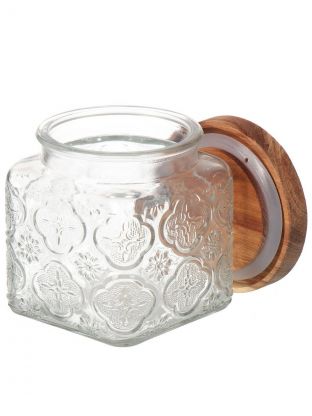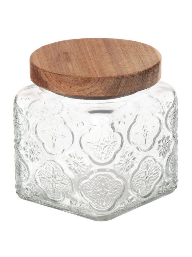 Объём — 0.5 л, размеры: 9.8x9.8x10.3 см. Квадратная форма, прозрачное стекло, герметичная деревянная крышка, рельефный дизайн. Подходит для хранения до 500 г сыпучих продуктов.