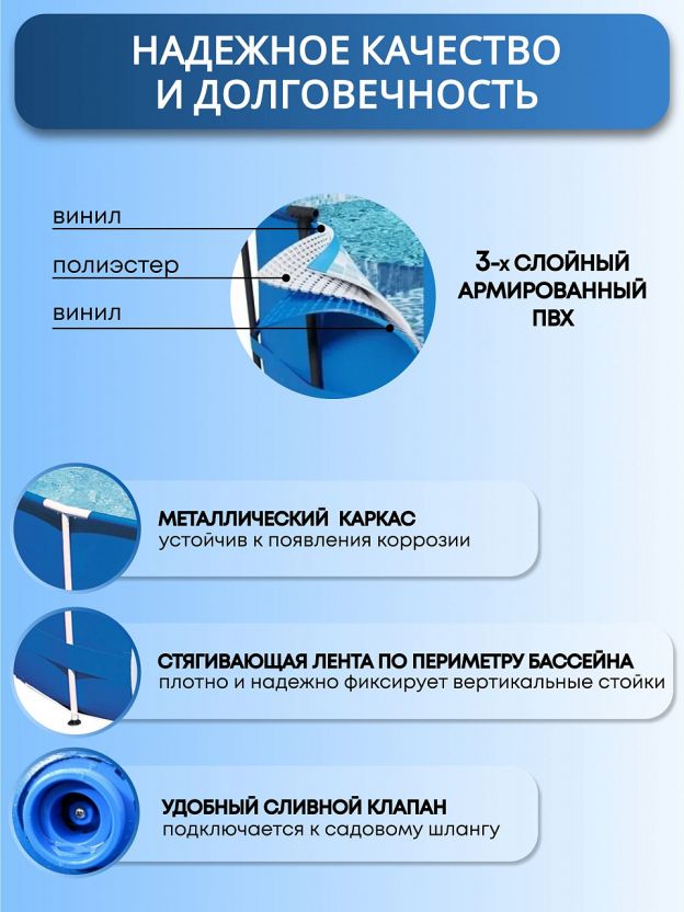 Бассейн для дачи Bestway Steel Pro - это не только возможность охладиться в летний зной, но и отличная альтернатива поездкам на пляж. Каркасный бассейн позволяет насладиться водными процедурами в любое время, не покидая пределов участка. Установка не требует специальных навыков.