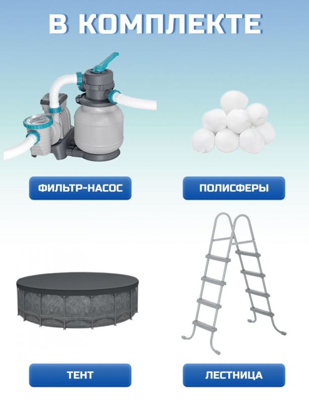 Покупка каркасного бассейна Bestway — это инвестиция в комфорт и удовольствие. Не требуется хранение в межсезонье, что экономит ваше время и силы. Сочетание высокого качества материалов и продуманных решений делает этот бассейн идеальным выбором для тех, кто ценит надежность и простоту в эксплуатации. С таким бассейном лето станет еще более ярким и запоминающимся!