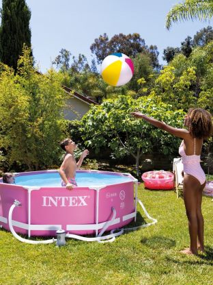 Каркасный бассейн Intex 244х76 см Pink Frame Pool — яркое лето для всей семьи: быстрое охлаждение, стильный дизайн, прочный стальной каркас и объём 2843 л для отдыха на даче или дома.