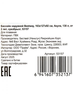 Бассейн надувной Bestway, 163х127х92 см, Акула, 53157, 130 л, от 2 лет, с разбрызгивателем