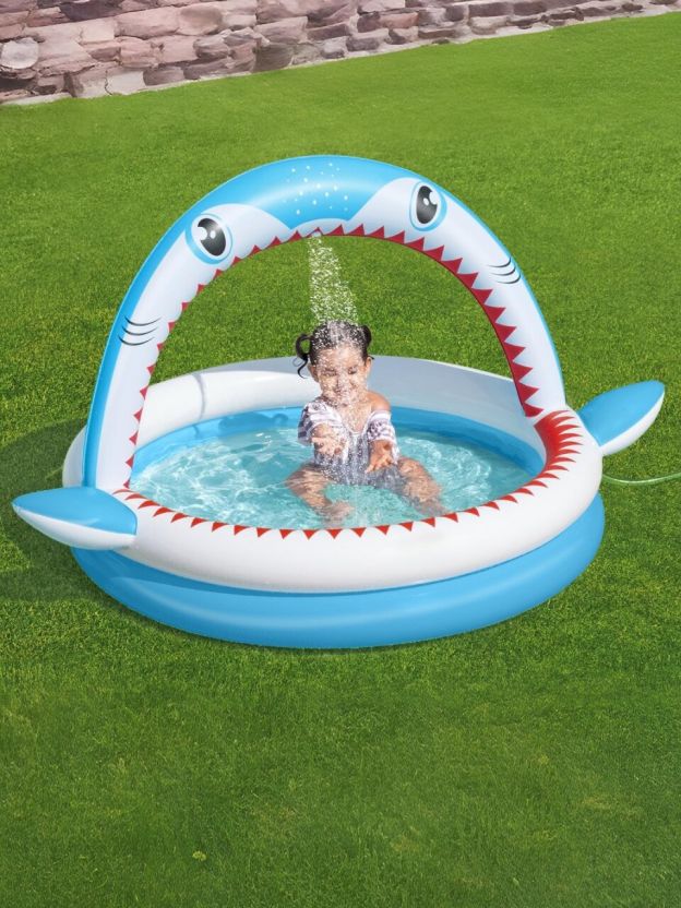 • Уникальный дизайн: бассейн с забавной акулой и встроенным разбрызгивателем превращает купание в игру.
