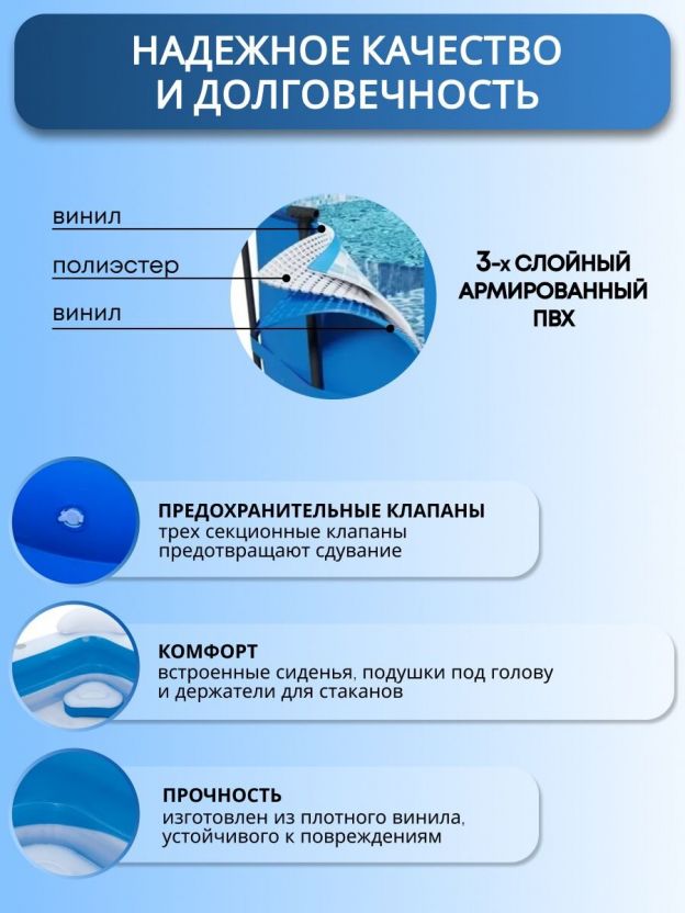 Этот надувной бассейн для дачи станет центром притяжения для детей и взрослых. Благодаря двум кольцам одинакового размера и удобным подушечкам под голову, отдых в нем будет максимально комфортным. Бассейн не требует сложной установки и легко надувается, что позволяет быстро подготовить его к использованию. Он не только приносит радость, но и способствует укреплению семейных связей, обеспечивая веселое времяпрепровождение на свежем воздухе.