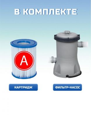 В комплекте идет фильтр-насос с производительностью 2006 л/ч, что позволяет поддерживать чистоту воды без лишних усилий. Картриджный фильтр типа A обеспечивает эффективную фильтрацию, а надувной борт добавляет комфорта и безопасности. Время установки бассейна составляет всего 10 минут, что позволяет быстро приступить к отдыху.