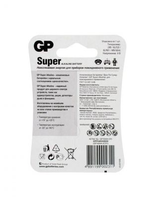 Батарейка GP, 9V (6LR61), Alkaline Super, щелочная, 9 В, блистер, 02786