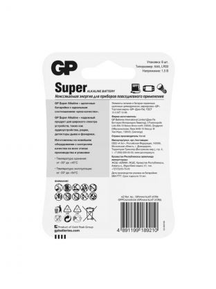 Батарейка GP, ААА (LR03, 24A), Alkaline Super, щелочная, 1.5 В, блистер, 8 шт, 24A4/4-2CR8, 18779