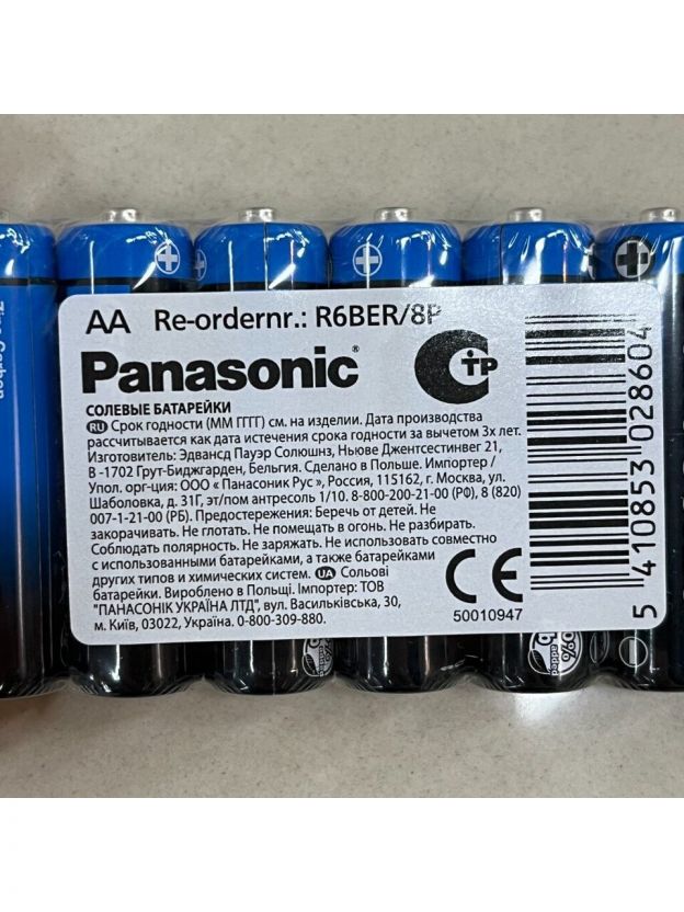 Батарейка Panasonic, АА (R6, 15D), General Purpose, солевая, 1.5 В, спайка, 8 шт