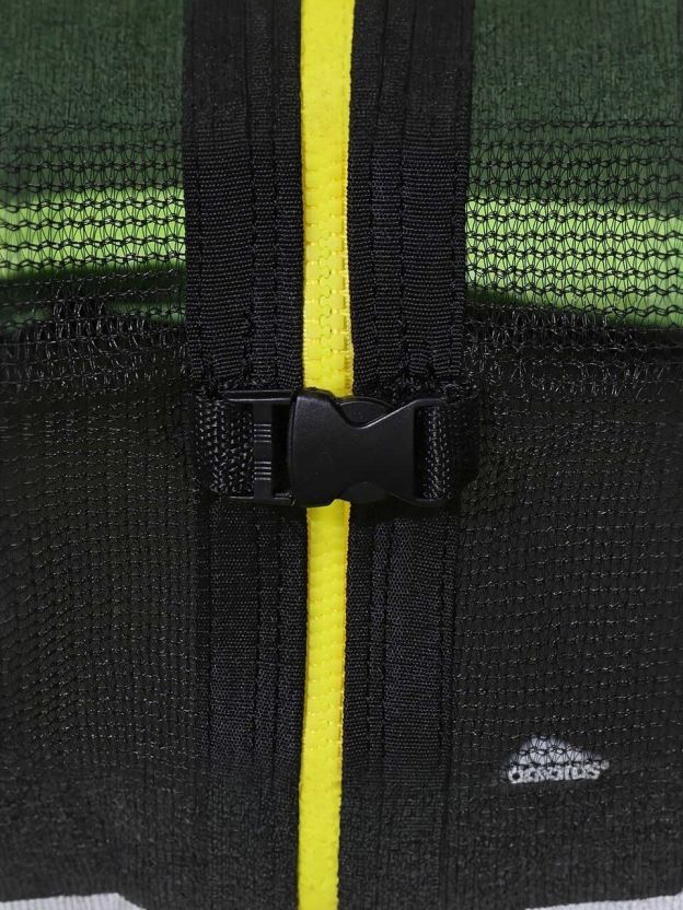 Защитная сеть входит в обязательную комплектацию батутов. Сетка батута устойчива к УФ. Инновационное крепление увеличивает рабочее пространство батута, исключает соприкосновение с пружинным механизмом, все элементы крепления закрыты мягким матом или выполнены из безопасных материалов. Вход на усиленной молнии, оборудован дополнительными фиксаторами, защищен от случайного открывания.
