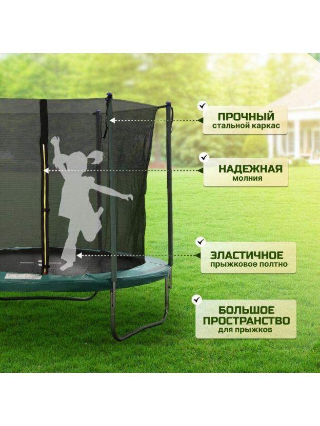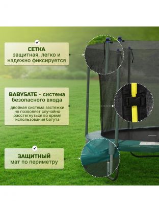 - Безопасность: защитная внутренняя сеть исключает падение с высоты, 3-слойный мат - соприкосновение с пружинным механизмом, двойная молния с фиксатором входа.