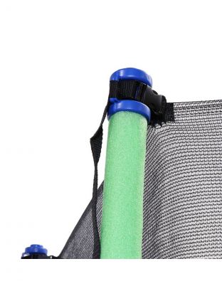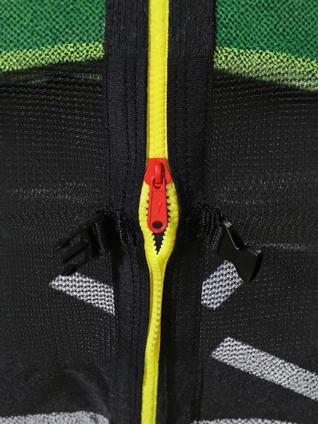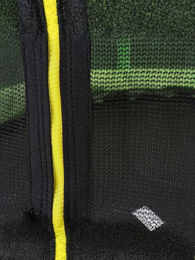 Защитная сеть входит в обязательную комплектацию батутов. Сетка батута устойчива к УФ полиэтиленовая сетка 100г/кв.м. Инновационное крепление увеличивает рабочее пространство батута, исключает соприкосновение с пружинным механизмом, все элементы крепления закрыты мягким матом или выполнены из безопасных материалов. Вход на усиленной молнии, оборудован дополнительными фиксаторами, защищен от случайного открывания.