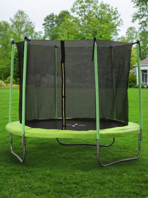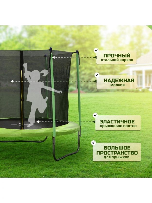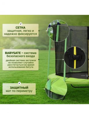 - Безопасность: защитная внутренняя сеть исключает падение с высоты, 3-слойный мат - соприкосновение с пружинным механизмом, двойная молния с фиксатором входа.