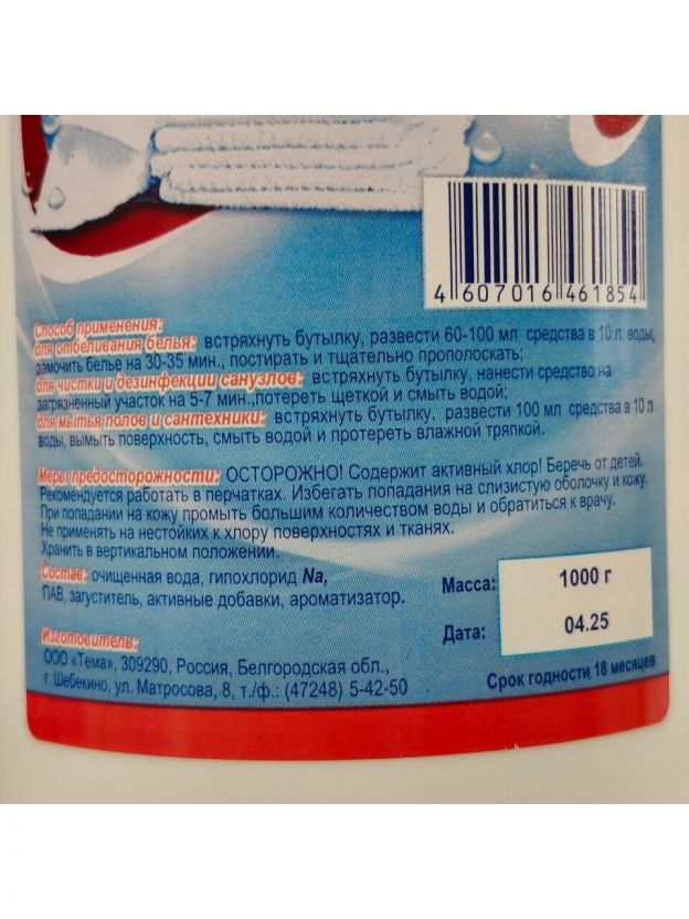 Хлоросодержащее средство «Белизна» применяется для отбеливания и удаления пятен с тканей, чистки ванн, раковин, унитазов, канализационных стоков, мытья пола, кафеля. Эффективно удаляет загрязнения, устраняет неприятный запах и уничтожает микробов. Подходит для стирки, замачивания, отбеливания вещей. Эффективна при чистке унитазов, душевых кабин, устраняет въевшиеся загрязнения.