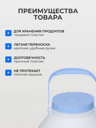 Бидон предназначен для хранения и транспортировки пищевых продуктов: воды, молока, масла, меда, варенья, круп, сахара. Бидон имеет винтовую крышку, которая достаточно плотно прилегает к корпусу, но не гарантирует полную герметичность. Для удобства переноски имеется удобная встроенная ручка.. Бидон изготовлен из пищевого пластика, который является полностью безопасным.