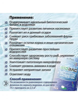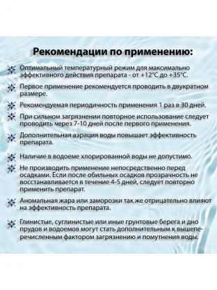 С биосоставом Биобак BB-P020 забота о водоеме становится проще и эффективнее. Это средство не только очищает воду, но и способствует созданию здоровой экосистемы, что в свою очередь улучшает условия обитания рыб и других водных обитателей. Используя данное средство, можно существенно улучшить качество воды, предотвратить цветение водоема и создать комфортные условия для отдыха и наслаждения природой.