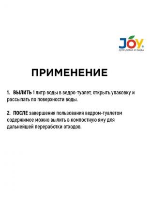 Способ применения: Вылить 1 литр воды в ведро-туалет, открыть упаковку, рассыпать по поверхности воды. Запах исчезает через 10-15 минут. После завершения пользования ведром-туалетом содержимое можно вылить в компостную яму для дальнейшей переработки отходов.