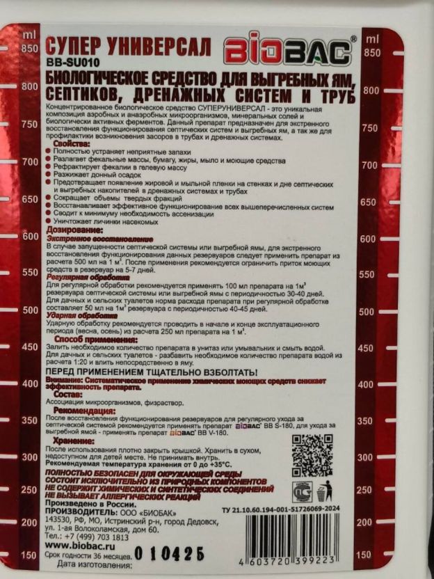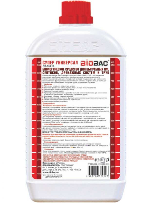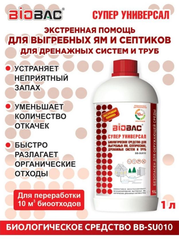 Биосостав для выгребных ям и септиков, Биобак, 1 л, дренажных систем и труб, BB-SU010