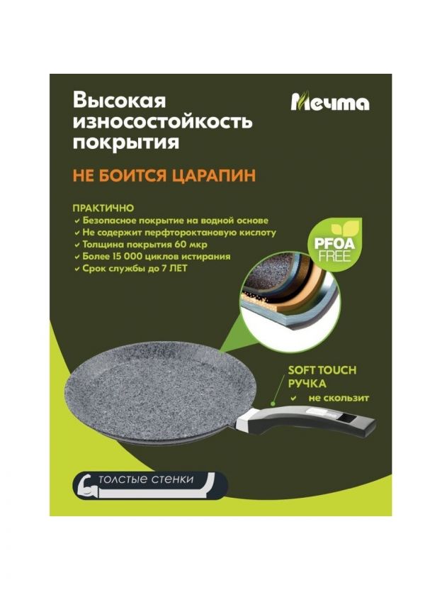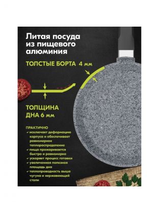 Блинница "Мечта" создана для тех, кто ценит качество и комфорт в процессе готовки. Ее антипригарное мраморное покрытие обеспечивает легкость в использовании и уходе, позволяя готовить без лишнего масла и жира, что делает блюда более полезными и диетическими. Бакелитовая ручка не нагревается, обеспечивая безопасность и удобство в обращении.